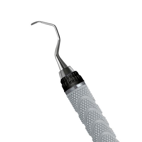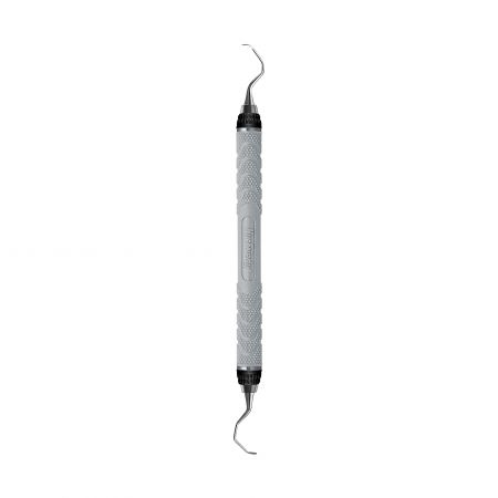 Gracey curettes, smaller blade and slightly longer terminal shank. Accentuated angle. Double-ended, easy-grip handle.