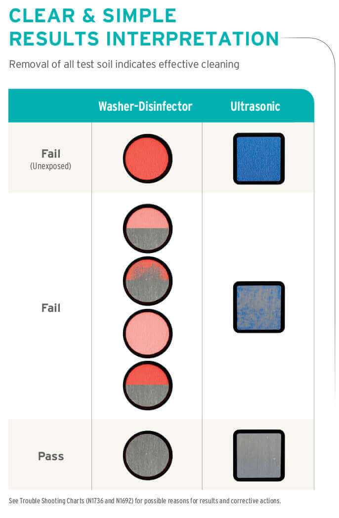- Colored test soil on strip is designed to parallell the removal of blood and bioburden from an instrument surface.