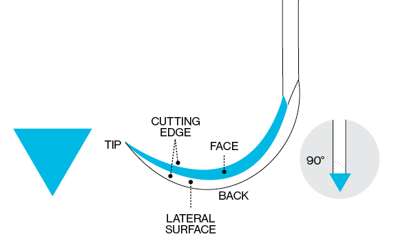 - Two cutting edges on a curved blade that end in a sharp point.
