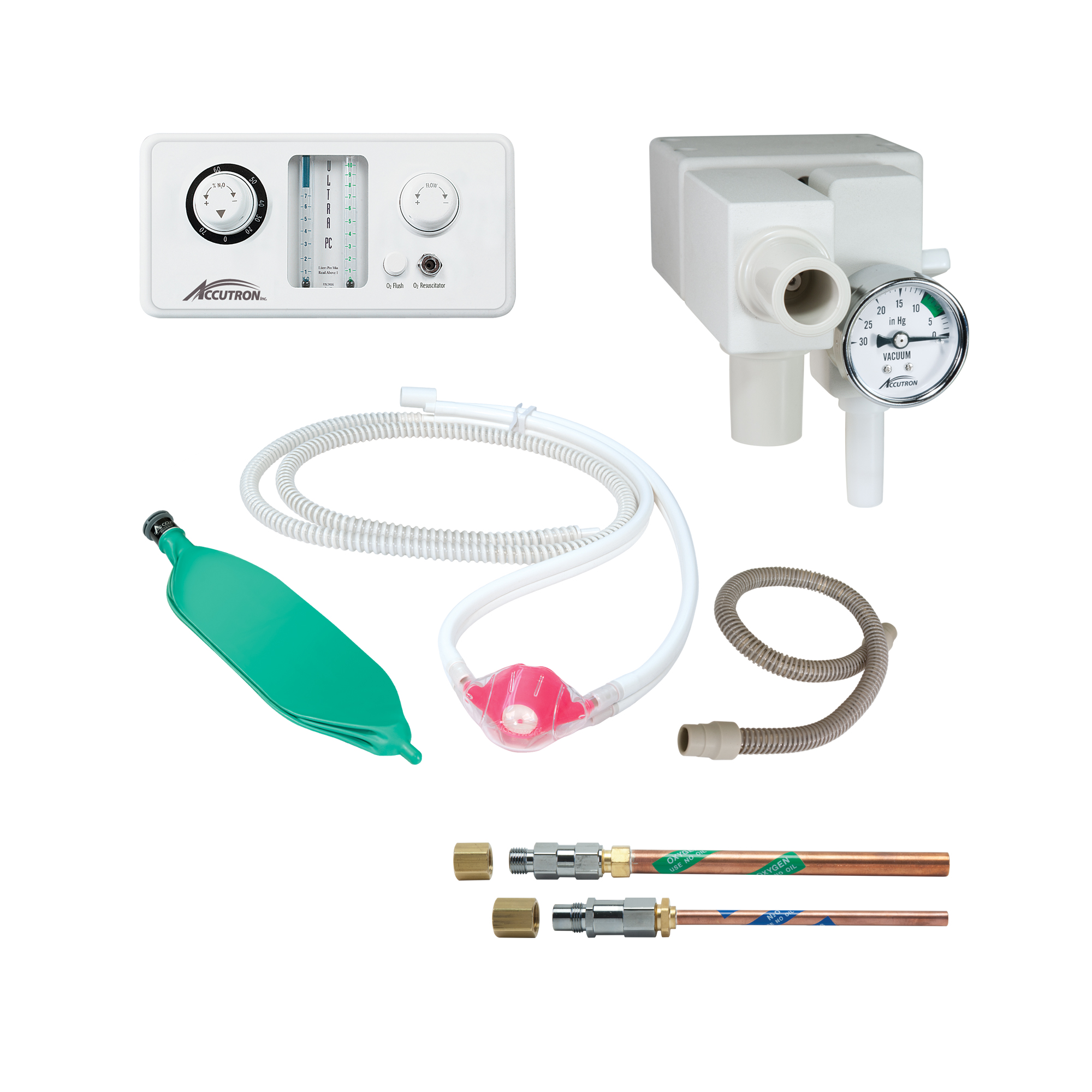 Includes: Ultra PC™ % Cabinet Mount Flowmeter, Mounting Hardware, Remote Flow System A, O2 and N2O Check Valve Risers, 25' of Vacuum Hose, 25' of Mixed Gas Hose, One 6' N2O Hose, One 6' O2 Hose, and Scavenging Circuit II (for RFS-A).